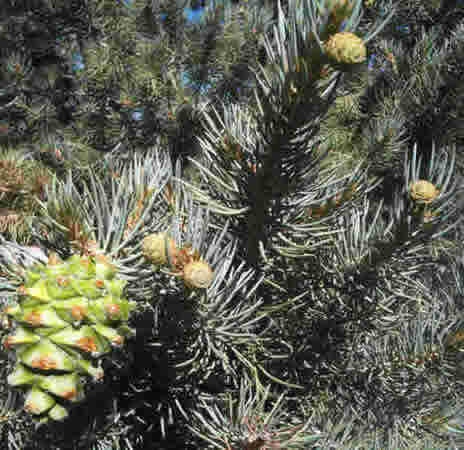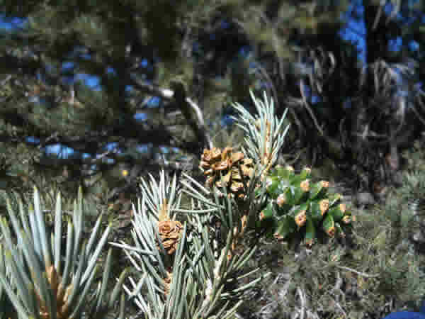 Pinyon Pine tree cones under development in late Spring. In the late Summer of 2010 this tree here will be optimal in maturity and size to yield a good harvest when nature permits it according to environmental conditions. This tree already has gone from pollination to cone development for approximately 16 months and lacks two more months for seeds to mature and be ready for the harvest for 2010. To Top