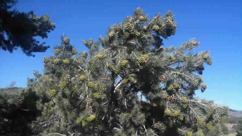 Pinyon Pine tree cones under development in late Spring. In the late Summer of 2010 this tree here will be optimal in maturity and size to yield a good harvest when nature permits it according to environmental conditions. This tree already has gone from pollination to cone development for approximately 16 months and lacks two more months for seeds to mature and be ready for the harvest for 2010. To Top